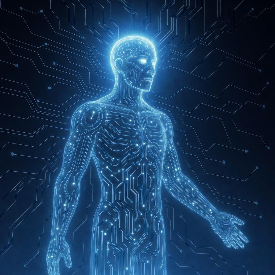 A digital illustration of a male human figure composed entirely of glowing blue circuit board patterns on a dark background. The figure stands with arms slightly outstretched, featuring intricate neural networks on the head and body. Bright cyan lines and nodes emphasize the cybernetic design.