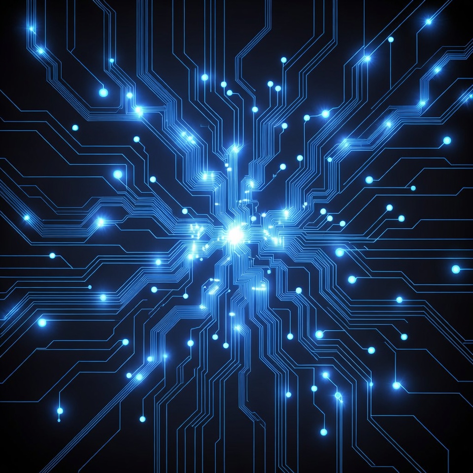 A digital illustration of a glowing blue circuit board pattern on a black background. Intricate neon blue traces and pathways radiate outward from a bright central glowing point. Small glowing nodes dot the network, creating a futuristic electronic design.