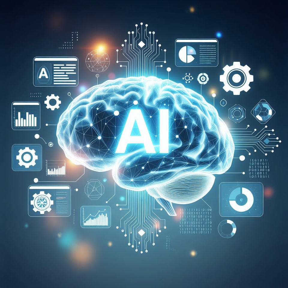 A glowing blue brain with 'AI' text overlay is centered on a dark background. Surrounding it are digital icons like gears, charts, code snippets, and circuit patterns in cyan and white hues. The futuristic design features glowing effects and neural network lines.