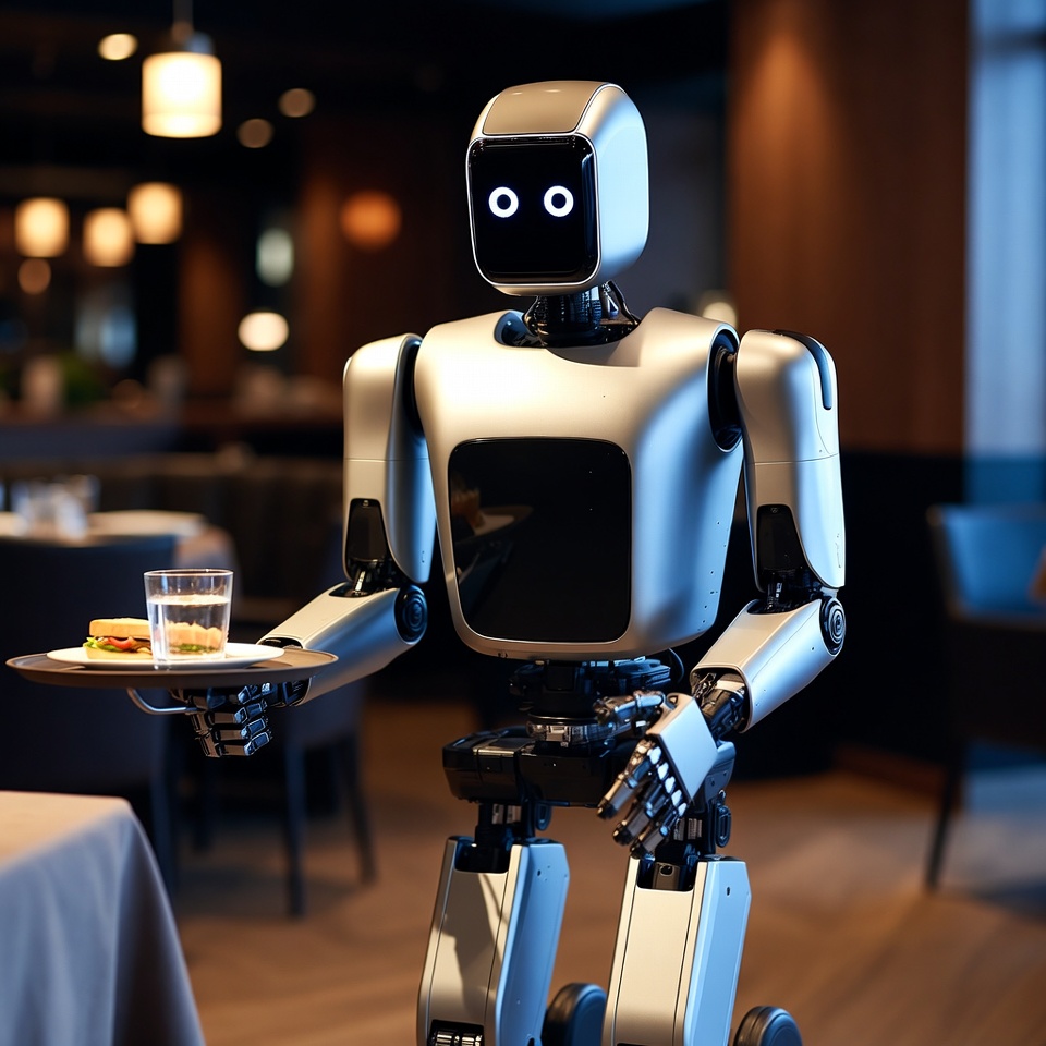 dining area, futuristic robot, glass water, glowing eyes, humanoid robot, modern interior, restaurant, robot arms, robot serving, sandwich, service robot, silver robot, tray, waiter, wheels, robot