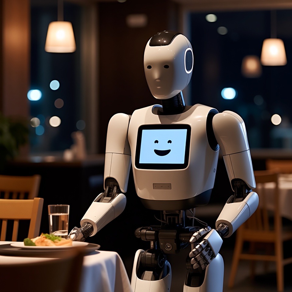 bokeh lights, chairs, food, glass, humanoid robot, isolated background, mechanical arms, night, plate, restaurant, serving food, smiling face, table, water, white robot, robot
