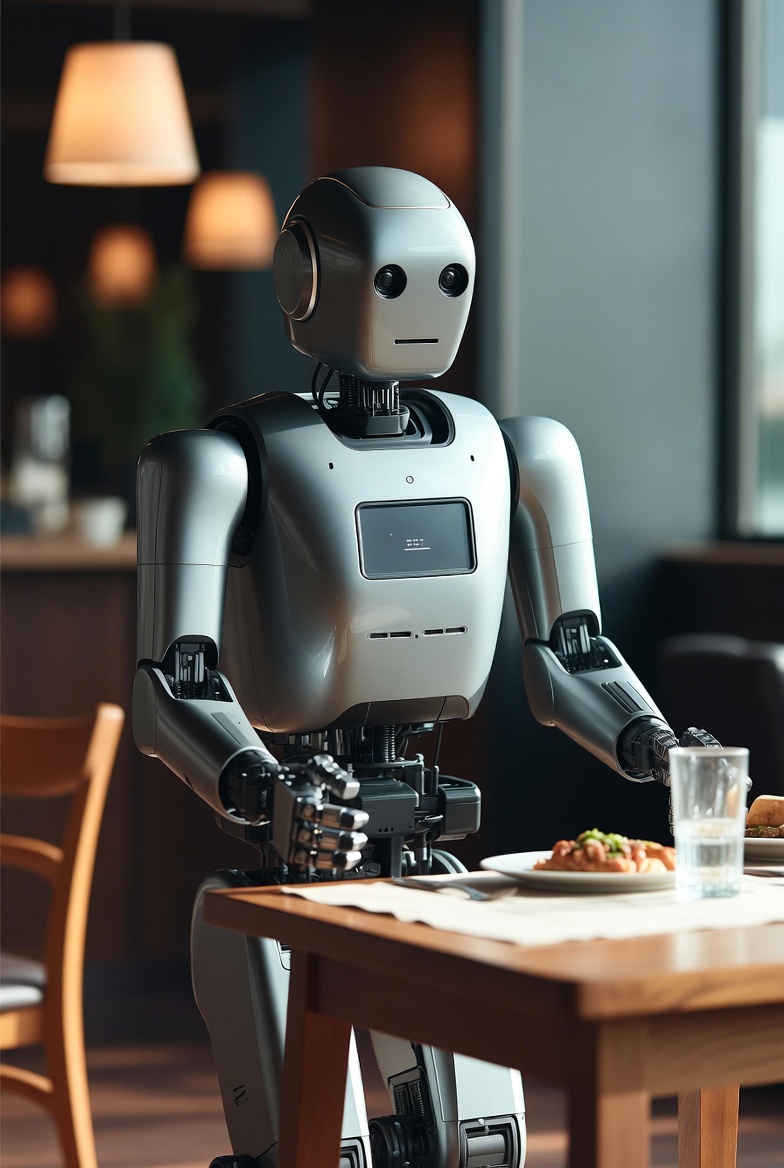 Robot eating at restaurant table