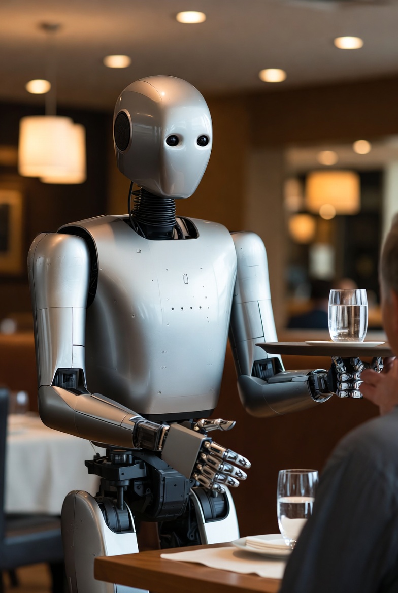 A tall silver humanoid robot with glowing eyes serves drinks on a tray to a customer at a restaurant table. The robot stands behind a white tablecloth with glasses and plates. The modern dining area features warm lighting and wooden decor.
