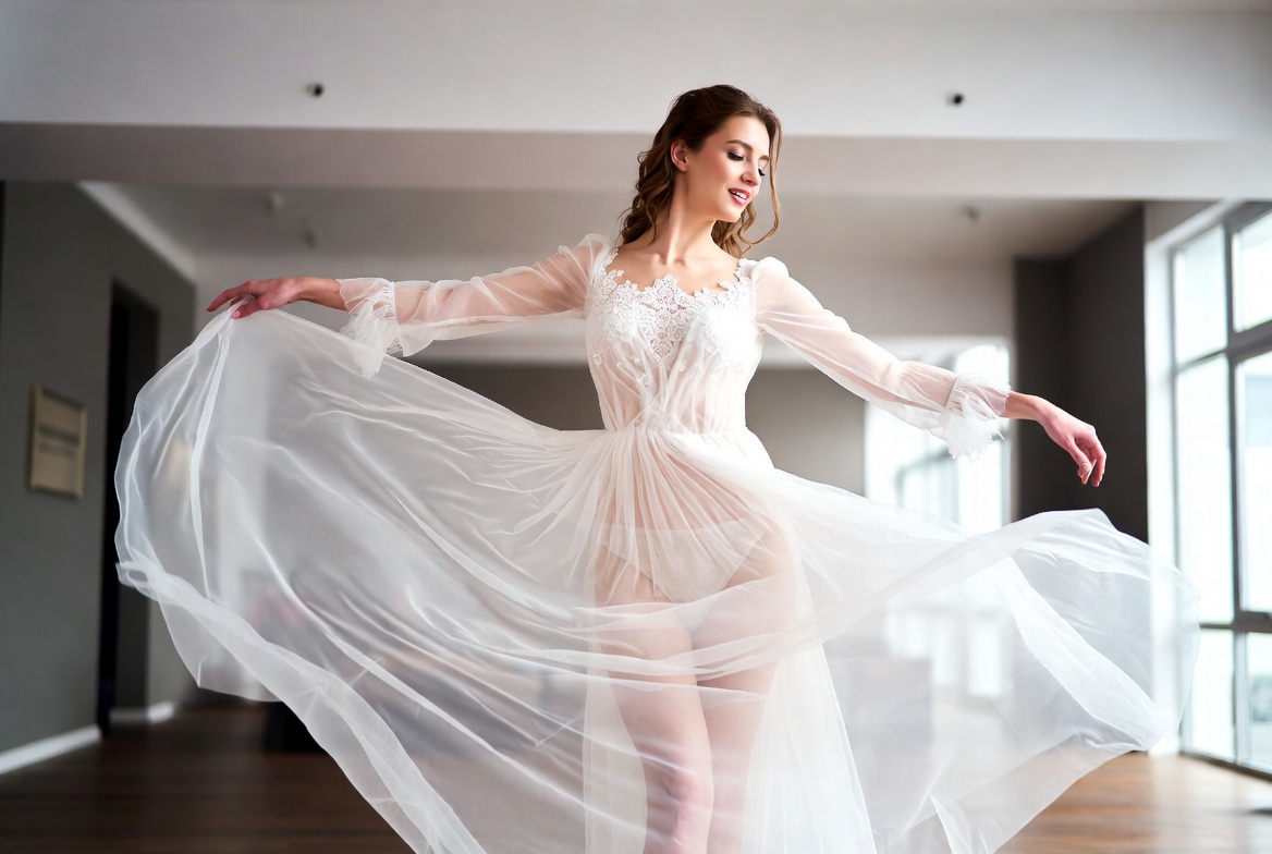 A woman with long wavy brown hair wears a sheer white lace gown with long sleeves and dances gracefully in a modern room. The gown flows dramatically around her as she extends her arms, revealing her legs beneath the translucent fabric. Large windows and gray walls form the minimalist background.