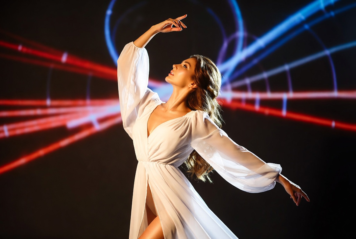arms extended, bell sleeves, blue lights, chiffon gown, circular lights, dance pose, dancing, dark background, elegant, female, graceful pose, light streaks, long hair, neon lights, profile view, red lights, studio lighting, wavy hair, white dress, woman