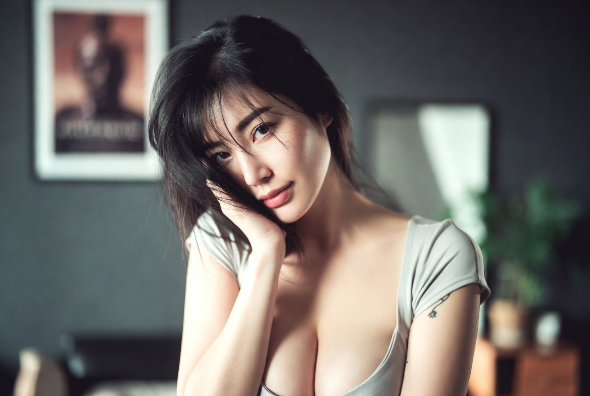 A young Asian woman with long dark hair gazes sideways at the camera. She wears a tight gray tank top that accentuates her cleavage and has a small tattoo on her arm. She poses in a modern room with dark walls, framed art, plants, and wooden furniture.
