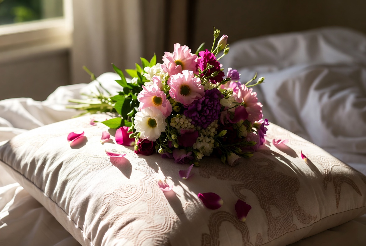 A vibrant bouquet of pink and white flowers, including daisies and chrysanthemums, lies on a white bed with scattered rose petals. Sunlight streams through a nearby window, casting soft shadows on the embroidered pillow and bedsheets. The arrangement features lush green foliage and delicate blooms in various shades of pink and purple.