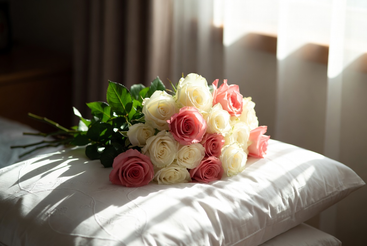 A bouquet of white and pink roses with green leaves rests on a white pillow. Soft sunlight streams through sheer curtains in the background, casting shadows on the bed. The roses are fresh and arranged naturally.
