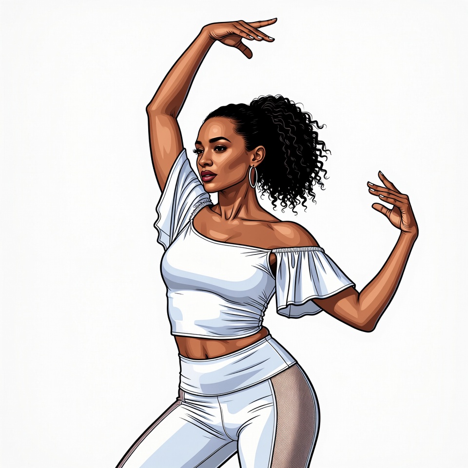 African-American, Black, arms raised, clipart, curly hair, dance pose, dancewear, dancing, dynamic pose, female, illustration, isolated background, off-shoulder top, ponytail, ruffle sleeves, white pants, white top, woman
