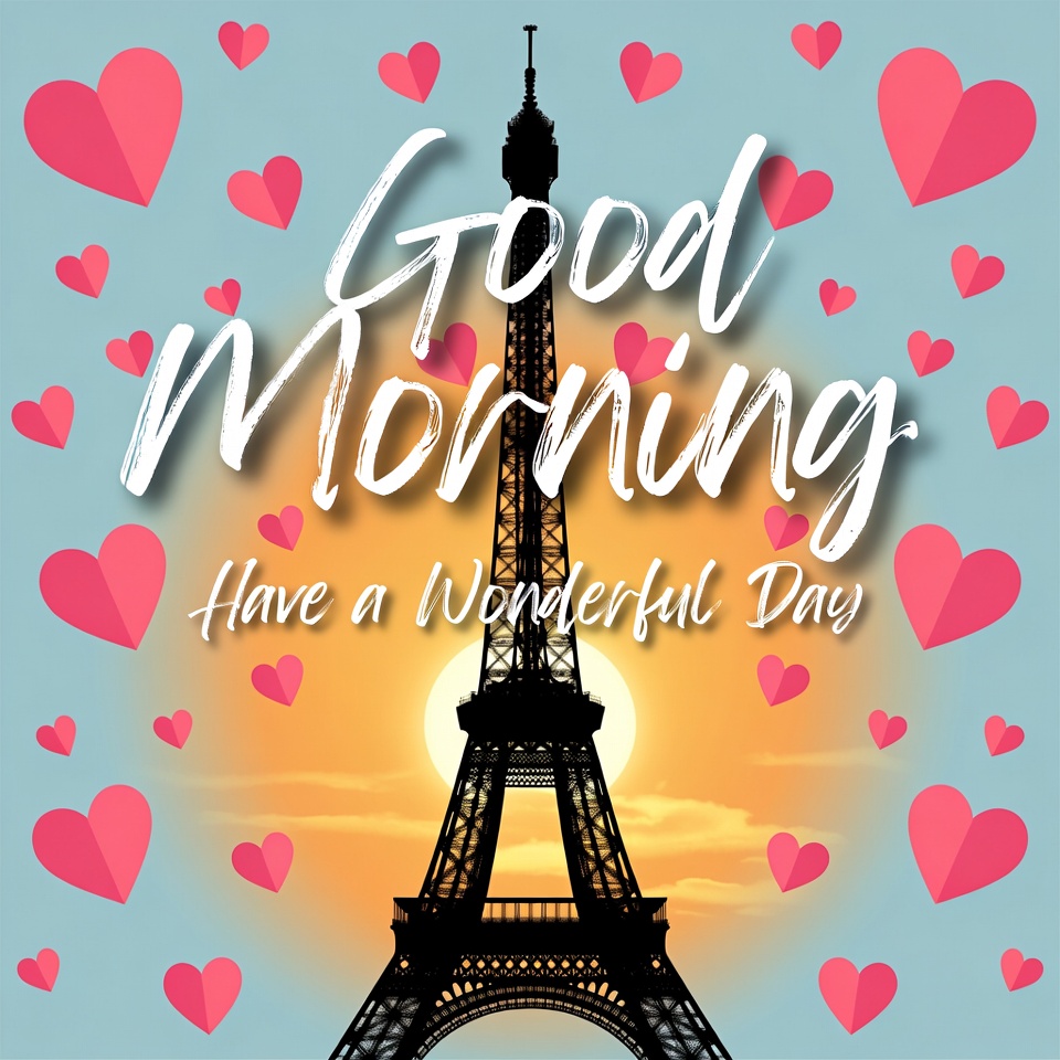 A vibrant illustration features the Eiffel Tower silhouette at sunset with a glowing sun behind it. Bold white text reads 'Good Morning' and 'Have a Wonderful Day' surrounded by numerous pink floating hearts. The background is a gradient of blue and orange.