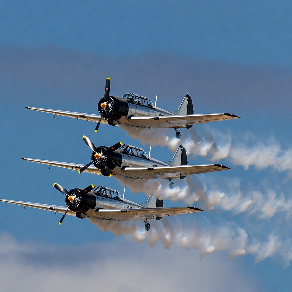 aerial maneuver, aerobatics, air show, aircraft formation, aviation, aviator aircraft, blue sky, flight display, formation flying, military trainer, prop plane, propeller aircraft, silver airplane, smoke trails, three planes, trainer plane, vintage plane, warbird, yellow propellers, T-6 Texan