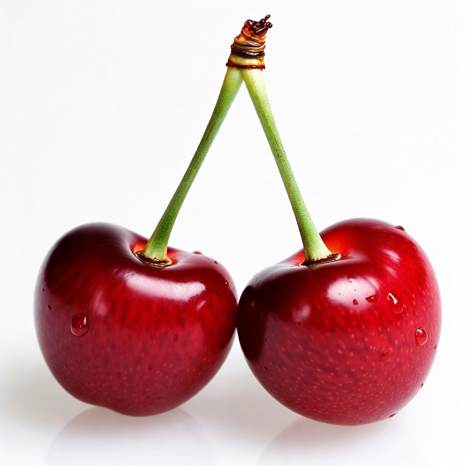 Two ripe red cherries with green stems are positioned side by side against a plain white background. Each cherry has a glossy surface with small water droplets. The stems cross slightly at the top.