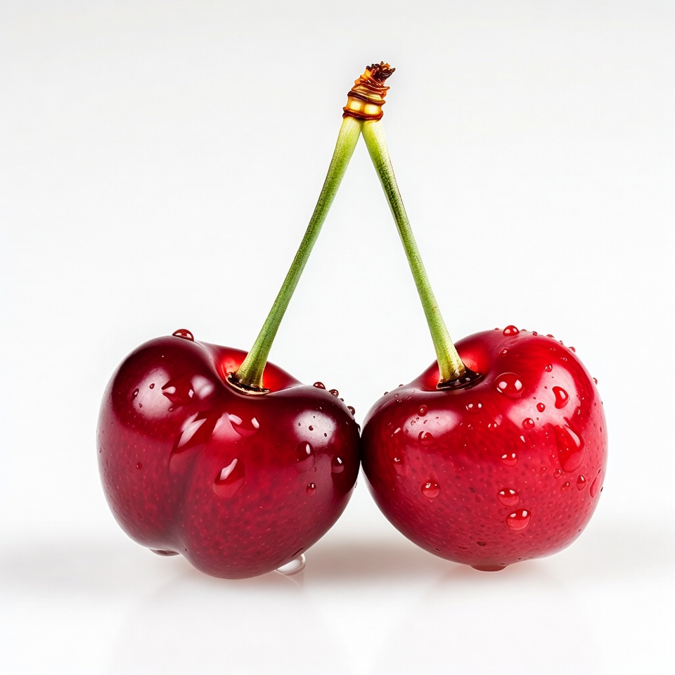 Two ripe red cherries with green stems are positioned together on a white background. Water droplets glisten on their shiny surfaces. The cherries appear fresh and vibrant.