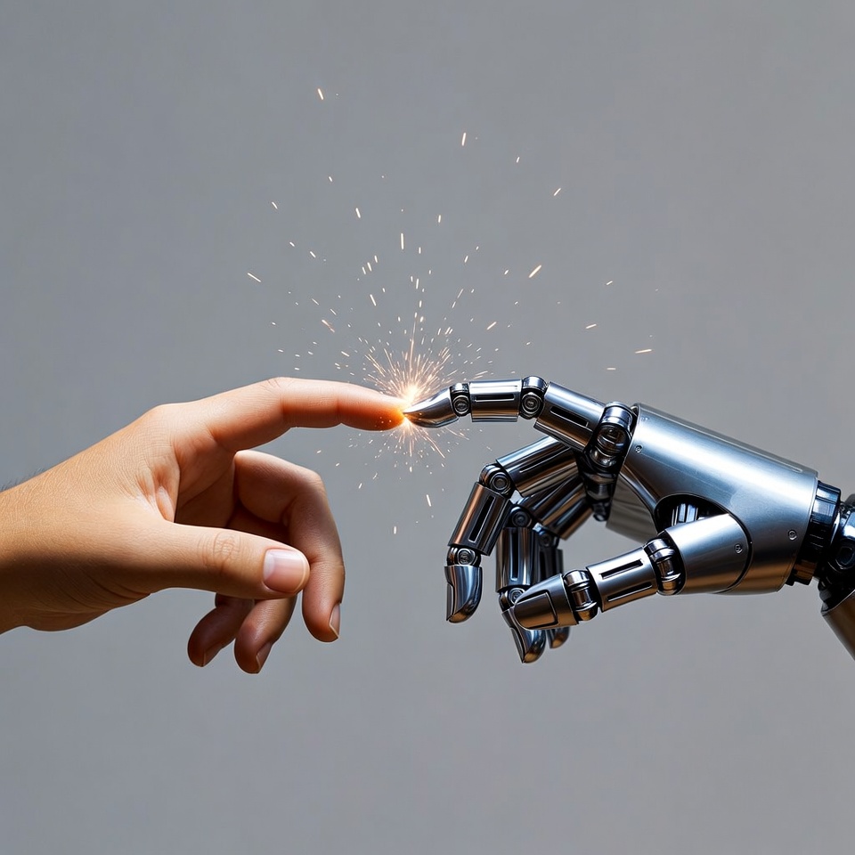 A human hand with light skin reaches toward a metallic robot hand against a gray background. Their fingertips nearly touch, creating a burst of bright sparks and glowing light at the point of contact. The robot hand features detailed mechanical joints and shiny silver plating.