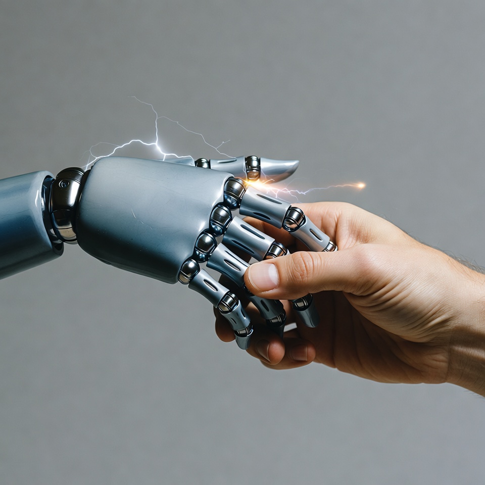 A human hand shakes a metallic robotic hand against a gray background. Electric sparks and energy glow at the point of contact between the flesh and mechanical fingers. The robot hand features gray articulated joints and smooth metallic surfaces.