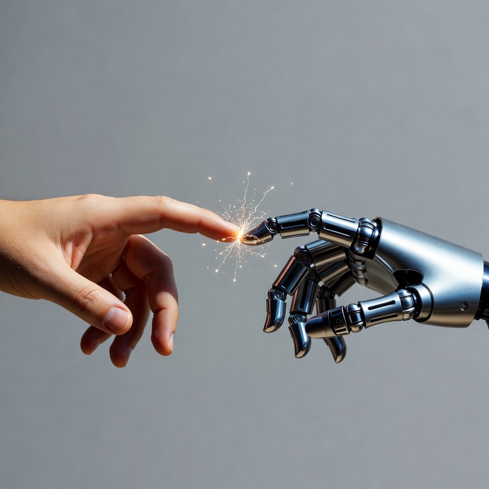 A human hand with light skin reaches toward a metallic robot hand on a gray background. Their index fingers nearly touch, creating a bright spark of light at the point of contact. The robot hand features detailed mechanical joints and silver plating.