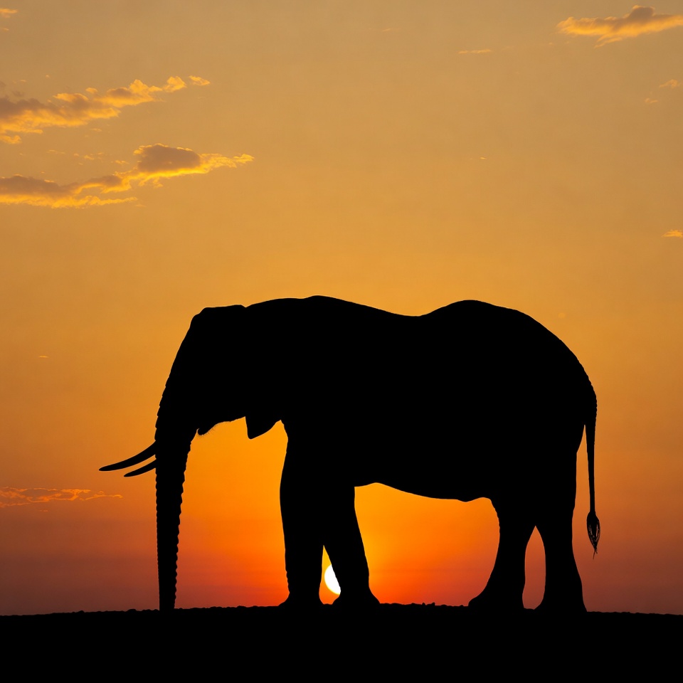 african elephant, animal, backlit, clouds, golden hour, horizon, nature, orange sky, safari, savanna, silhouette, sunset, tail, trunk, tusks, wildlife, elephant
