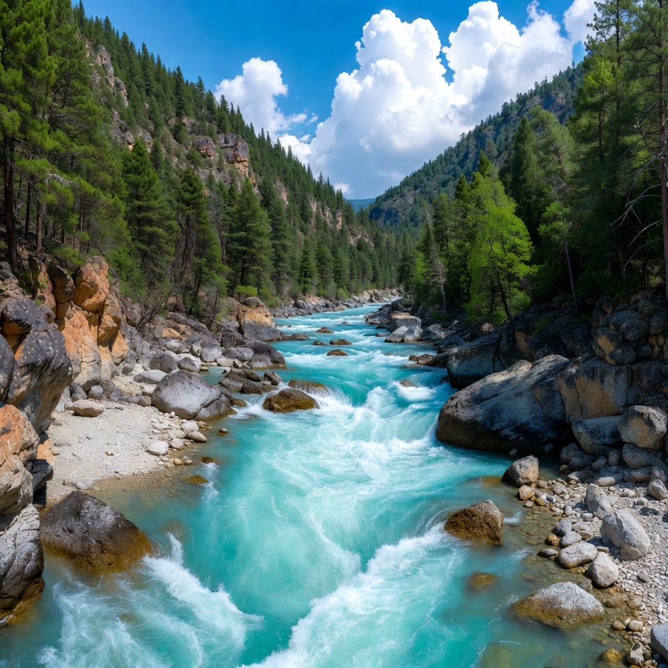 alpine scenery, blue sky, boulders, clear water, coniferous trees, flowing water, forest river, green trees, mountain stream, mountain valley, nature landscape, pine forest, rapids, river rocks, rocky cliffs, steep mountains, valley gorge, white clouds, whitewater rapids, turquoise river