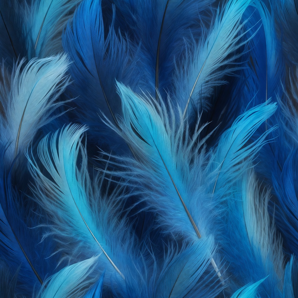 A seamless pattern features overlapping blue feathers in various shades from deep turquoise to light cyan and white. The feathers are fluffy with detailed barbs and soft textures. The design repeats continuously for use as wallpaper or background.