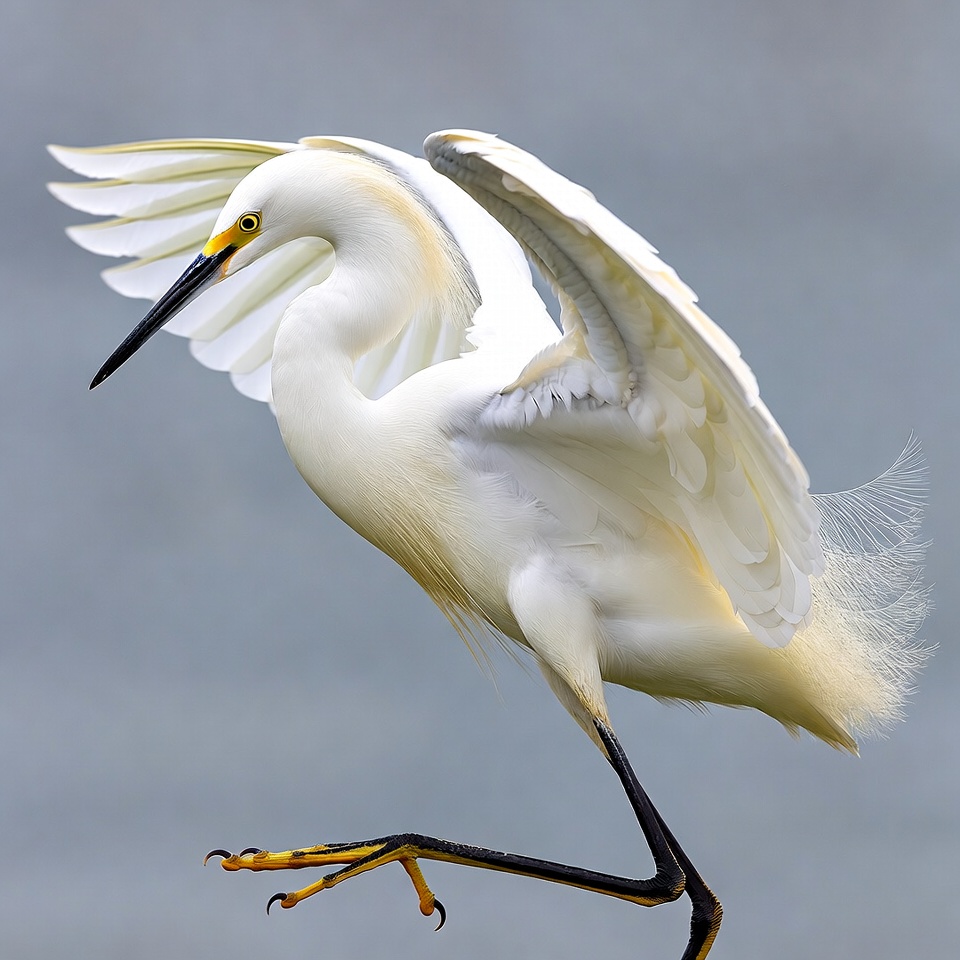 A snowy egret stands on one leg with wings fully spread wide. Its white feathers glow against a gray background, featuring a long black beak with yellow base and black legs with yellow feet. The bird tilts its head slightly while displaying its plumage.