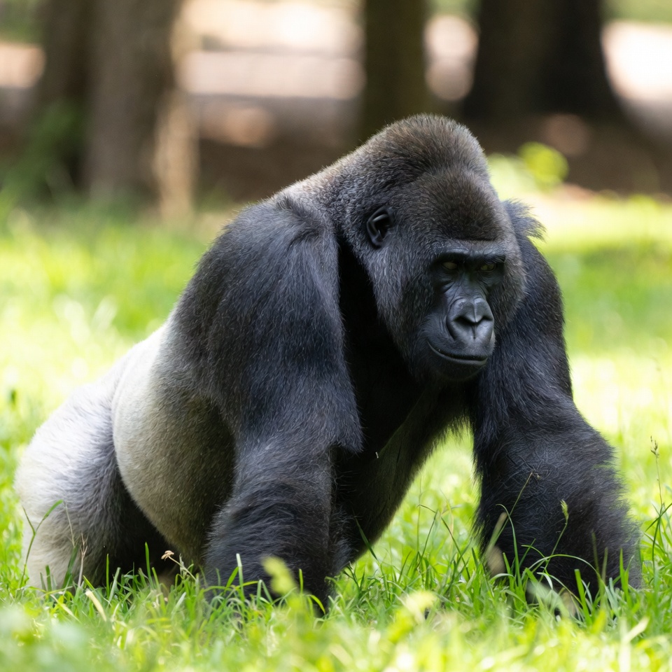 animal, ape, black fur, forest, forest background, grass, green grass, large gorilla, mammal, nature, outdoors, powerful, primate, silverback gorilla, sitting, strong arms, trees, wild animal, wildlife, zoo animal, gorilla