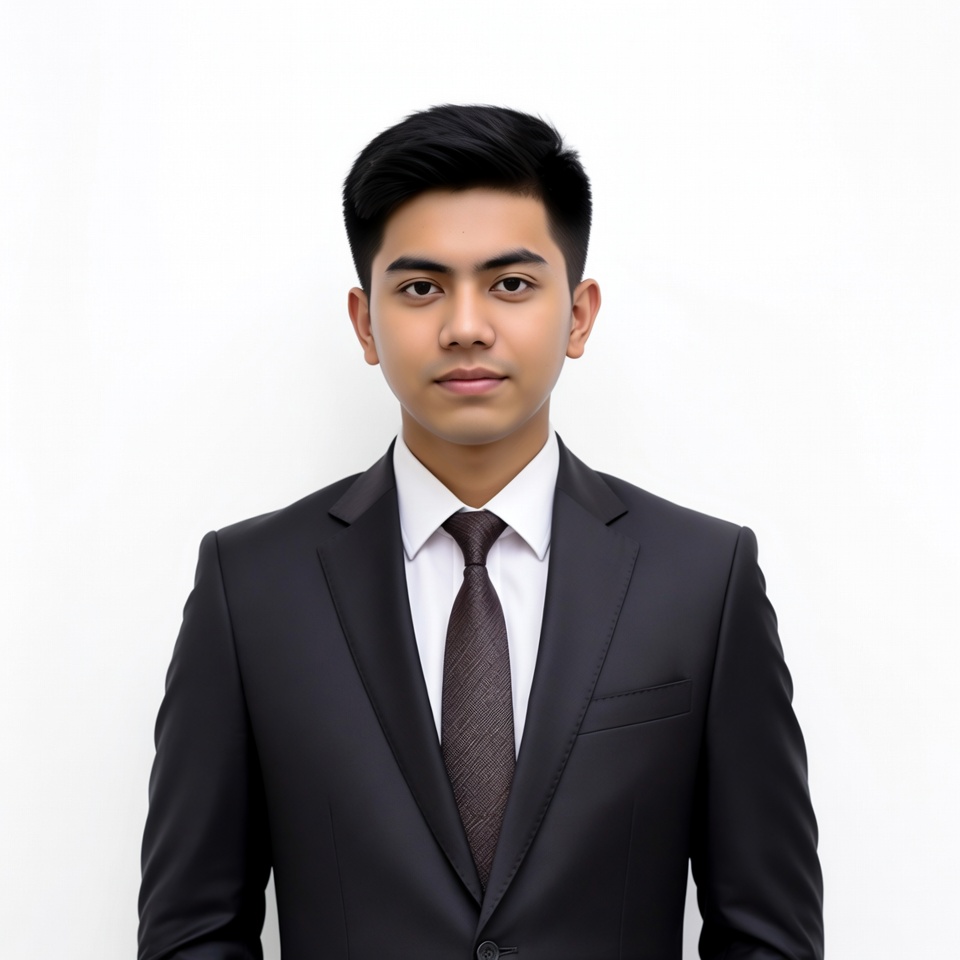 A young Asian man with short black hair stands against a white background wearing a black suit, white shirt, and maroon tie. He faces the camera directly with a neutral expression. The image is a professional headshot portrait.
