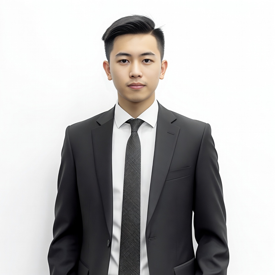 East Asian, black suit, business attire, dark tie, dress shirt, formal wear, headshot, male, man, necktie, portrait, professional, short hair, standing, suit jacket, white background, white shirt, young man, Asian man