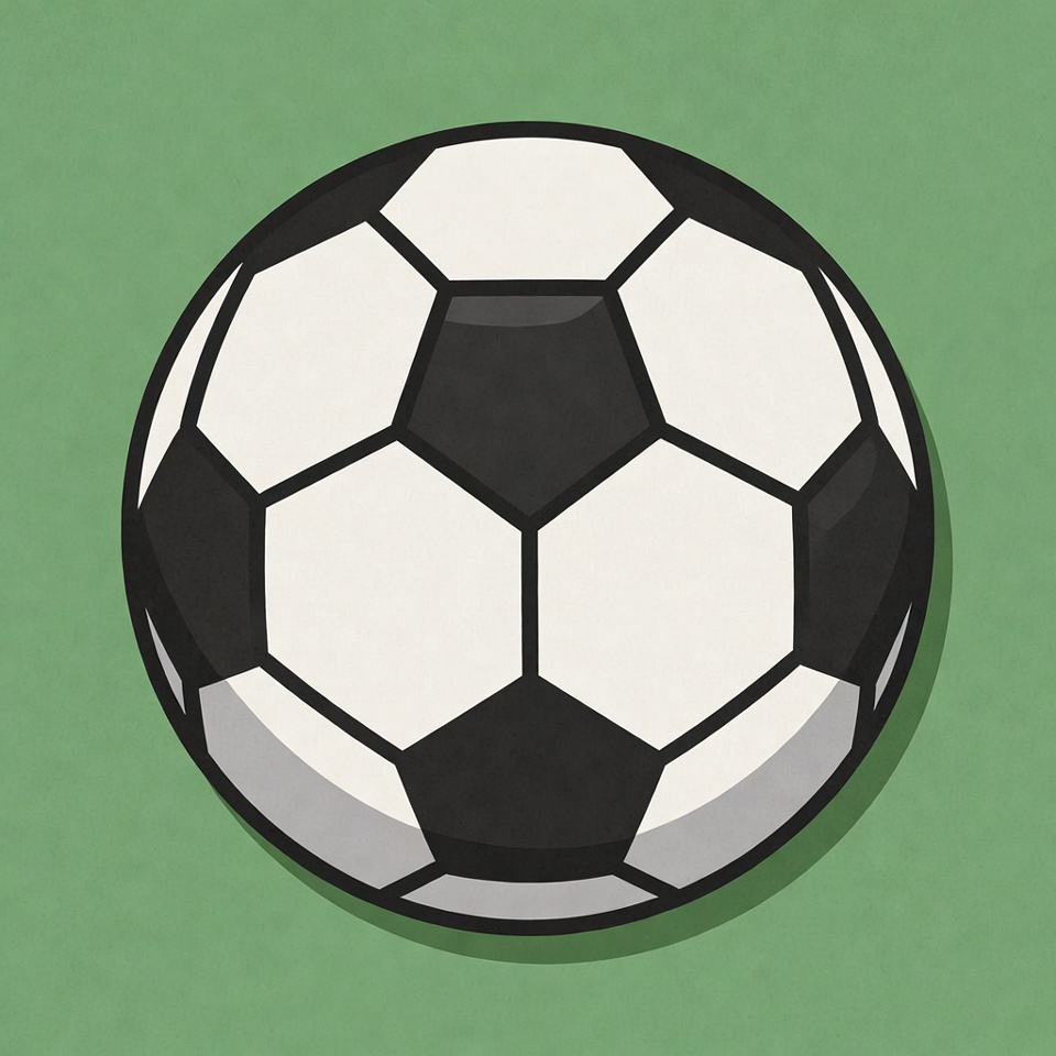 A black and white soccer ball with pentagonal patterns sits centered on a bright green field. The illustration features clean lines and a simple, isolated background. The ball appears three-dimensional with subtle shading.