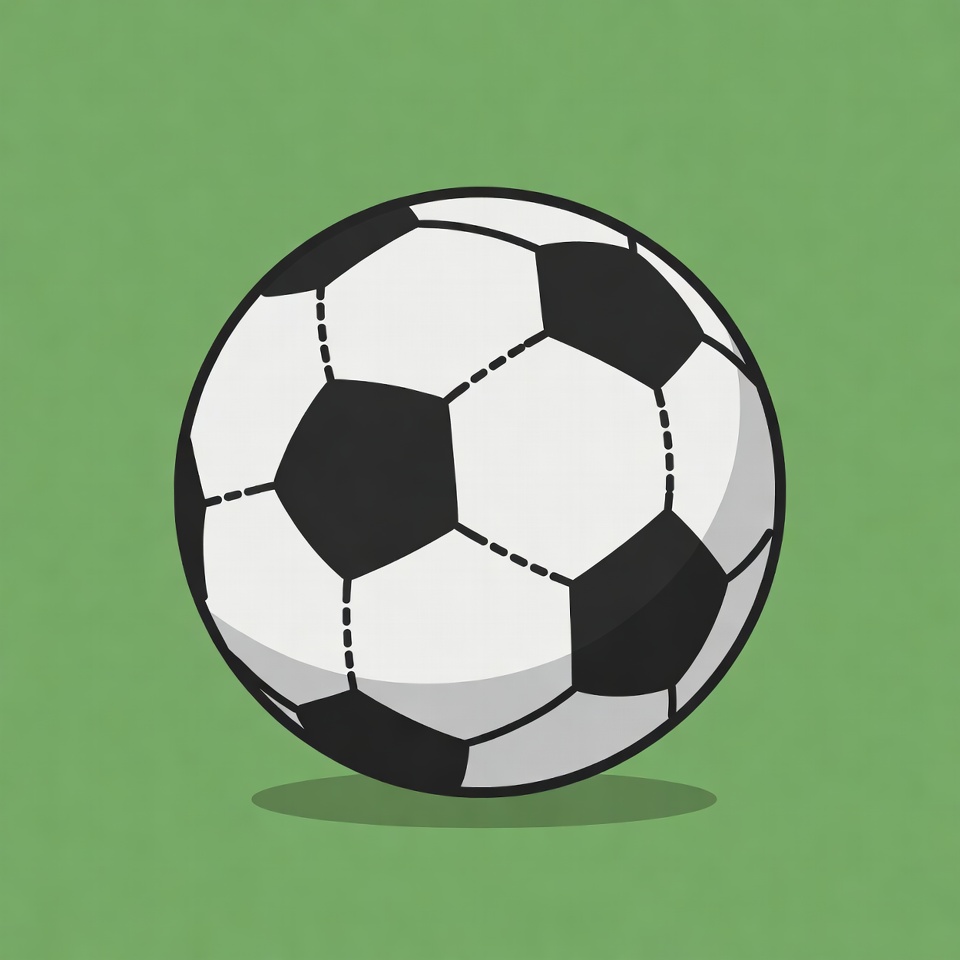 ball, black white, cartoon, clipart, field, football, game, green background, illustration, isolated, kick, pentagons, round, soccer, sport, sports equipment, soccer ball