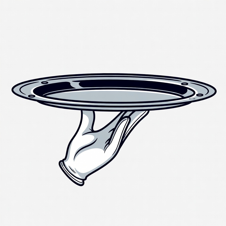 A white gloved hand holds a shiny silver serving tray at an angle. The tray is empty and features a polished rim. The illustration is on a plain white isolated background.