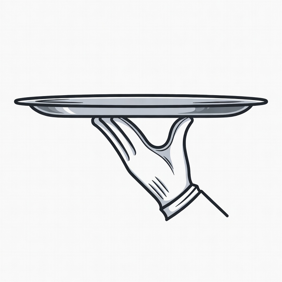 clipart, empty tray, gloved hand, holding tray, illustration, isolated background, line art, round tray, service hand, serving tray, silver tray, vector graphic, waiter hand, white glove, hand