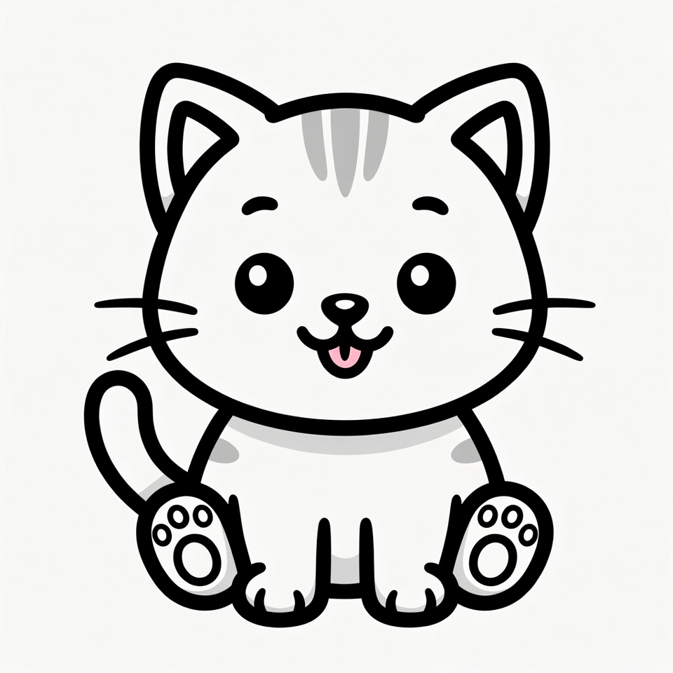 adorable cat, animal, big eyes, cartoon kitten, cat, chibi kitten, clipart, cute kitten, fun kitten, gray tabby, illustration, isolated background, kawaii cat, line art, pet illustration, sitting kitten, smiling cat, tongue out, vector cat, kitten
