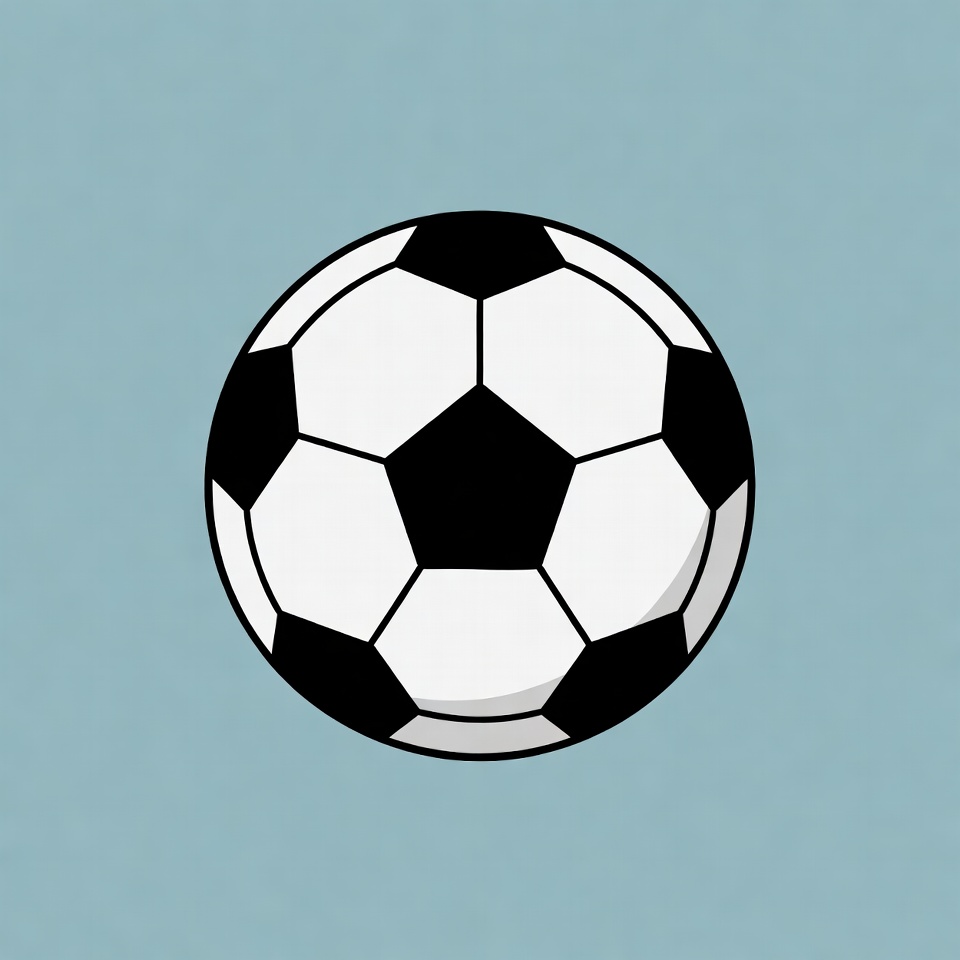 A simple illustration of a classic black and white soccer ball with pentagonal patterns. It is centered on a light blue background. The design features bold black pentagons on a white base.