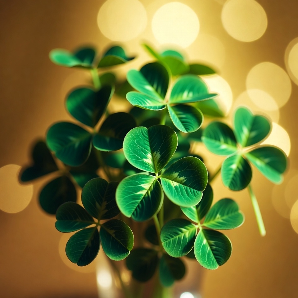 St Patricks Day, bokeh background, clover plant, foliage, glass vase, golden lights, green leaves, isolated plant, luck symbol, lucky clover, nature, shamrock, soft focus, vibrant green, four-leaf clover