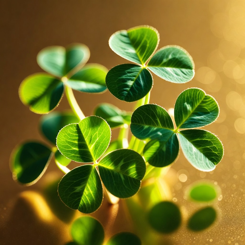 A cluster of vibrant green four-leaf clovers stands on a shiny golden surface. The leaves are fresh and detailed with natural veins, illuminated by soft lighting that creates glowing highlights and subtle shadows. Reflections of the clovers appear on the metallic background below.
