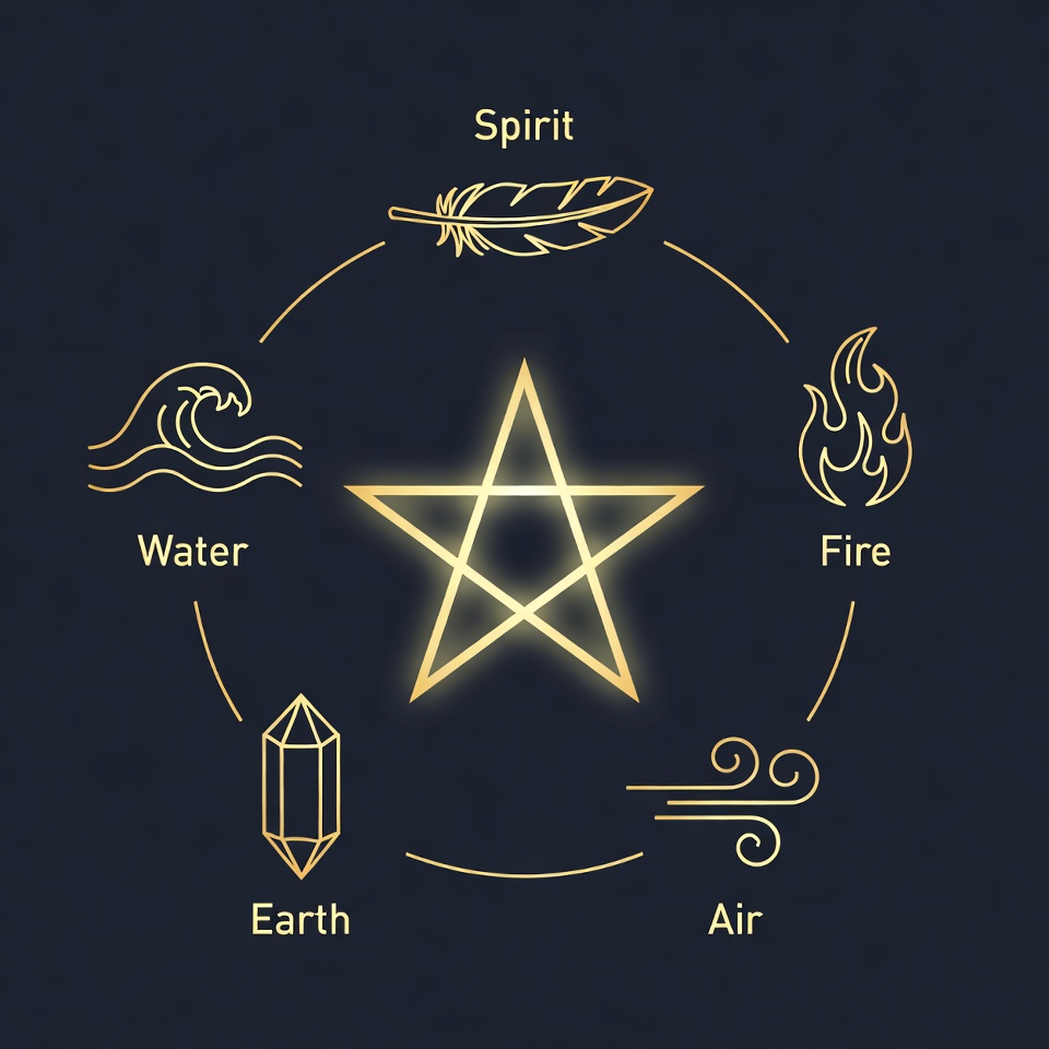 A glowing golden pentagram is centered in a circular diagram on a dark background. The four classical elements—water with waves, fire with flames, air with wind swirls, and earth with a crystal—are positioned at the points, connected by a gold circle. A feather labeled 'Spirit' tops the design.