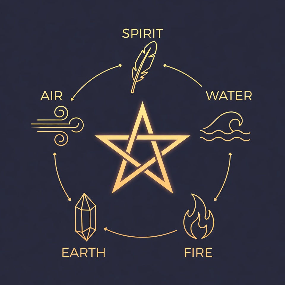 A glowing golden pentagram is centered in a circular diagram on a dark blue background. The five elements are arranged around it: Earth with a crystal, Air with wind swirls, Fire with flames, Water with waves, and Spirit with a feather. Golden lines connect the elements in a circular flow.
