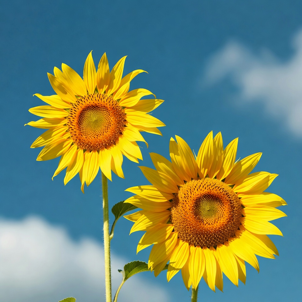 blooming sunflowers, blue sky, bright petals, clouds, field flowers, floral, flower stems, green leaves, natural light, nature, orange centers, sky background, summer flowers, two sunflowers, vivid yellow, yellow flowers, sunflowers