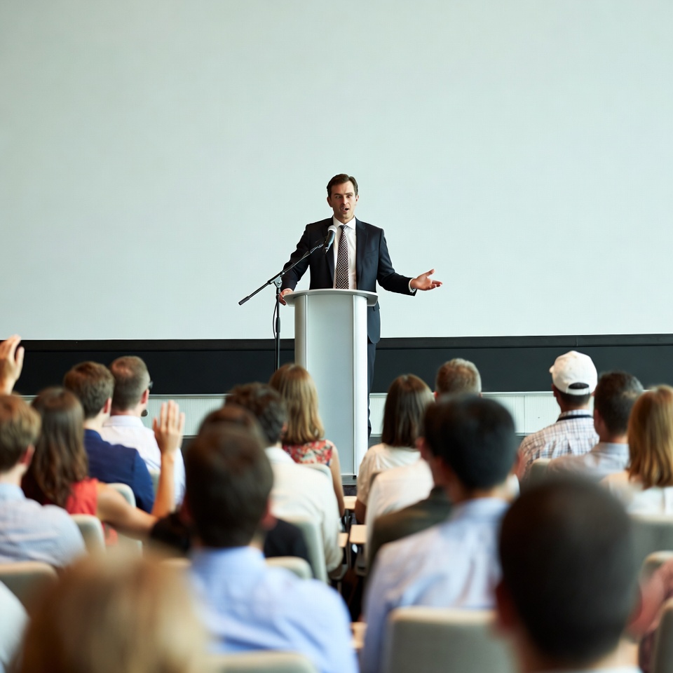 attentive, audience, business, chairs, conference, crowd, diverse, event, formal attire, gesturing, hands raised, listeners, meeting, men, microphone, people, podium, presentation, public speaking, speaker, speaking, stage, suit, white wall, women, man