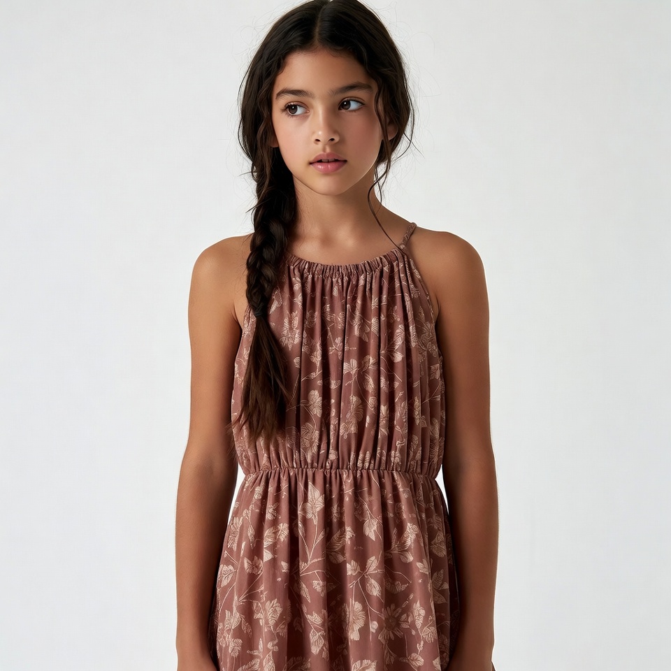 A young girl with long dark braided hair stands frontally wearing a sleeveless rust-colored dress with floral patterns. The dress features thin spaghetti straps and a loose, flowing fit. She poses against a plain white background.