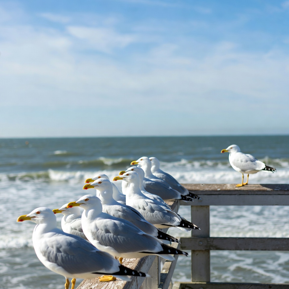 beach, birds, blue sky, clouds, coastal, flock, nature, ocean, pier, railing, sea, shoreline, sky, standing birds, water, waves, white birds, wildlife, wooden pier, yellow beaks, seagulls