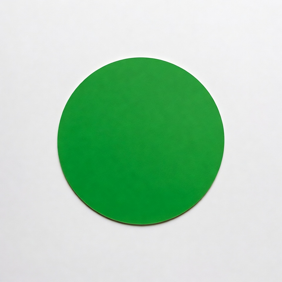A solid green circle is centered on a plain white background. The circle has a smooth, matte finish and uniform color. It is perfectly round and isolated.