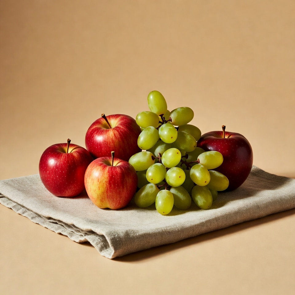A cluster of vibrant red apples and bunches of green grapes arranged on a beige linen cloth. The fruit is placed on a neutral tan background, showcasing their fresh textures and colors. Several apples surround the central grapes in a simple still life composition.