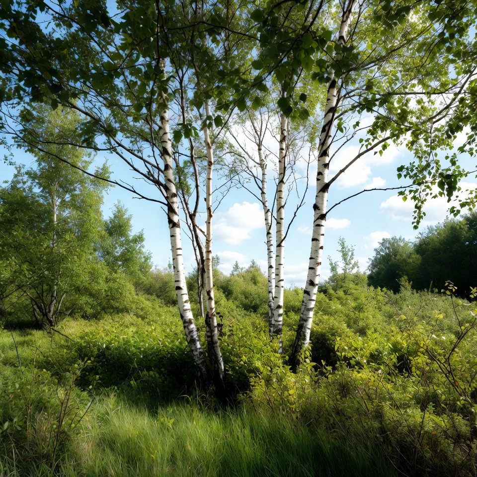 Several tall birch trees with white bark and black markings stand prominently in a lush green forest. The trees are surrounded by dense green underbrush and grass at their base. A clear blue sky with scattered white clouds peeks through the canopy above.