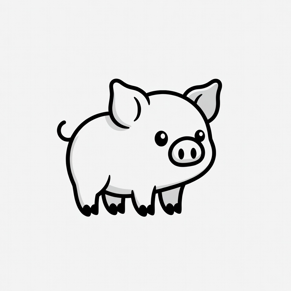A cute cartoon illustration of a baby pig stands on all fours against a white background. The pig has large expressive eyes, pink snout, floppy ears, curly tail, and black hooves. It features a simple black outline style with minimal shading.