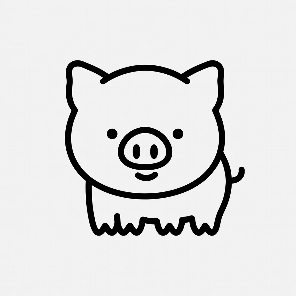 A simple black line drawing of an adorable cartoon pig with large eyes and a smiling snout. The pig stands on four legs with a curly tail and rounded body. It is isolated on a white background.