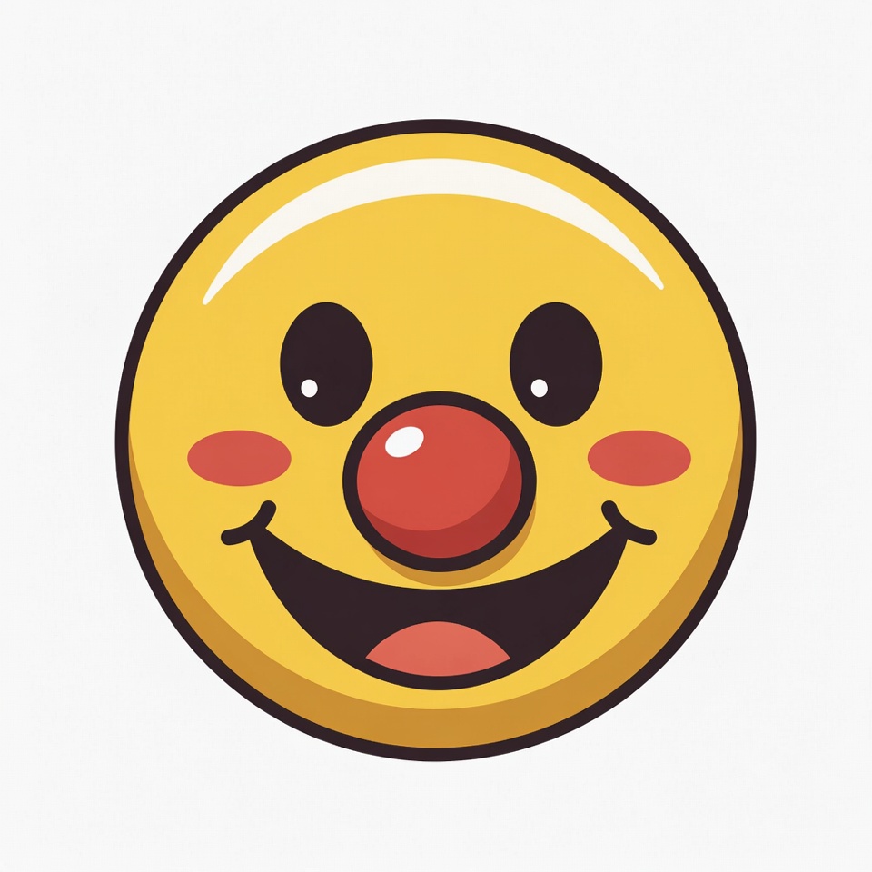 big smile, black eyes, cartoon, clipart, clown face, emoji, fun, happy face, illustration, isolated background, playful, red nose, rosy cheeks, smiling clown, yellow face, clown