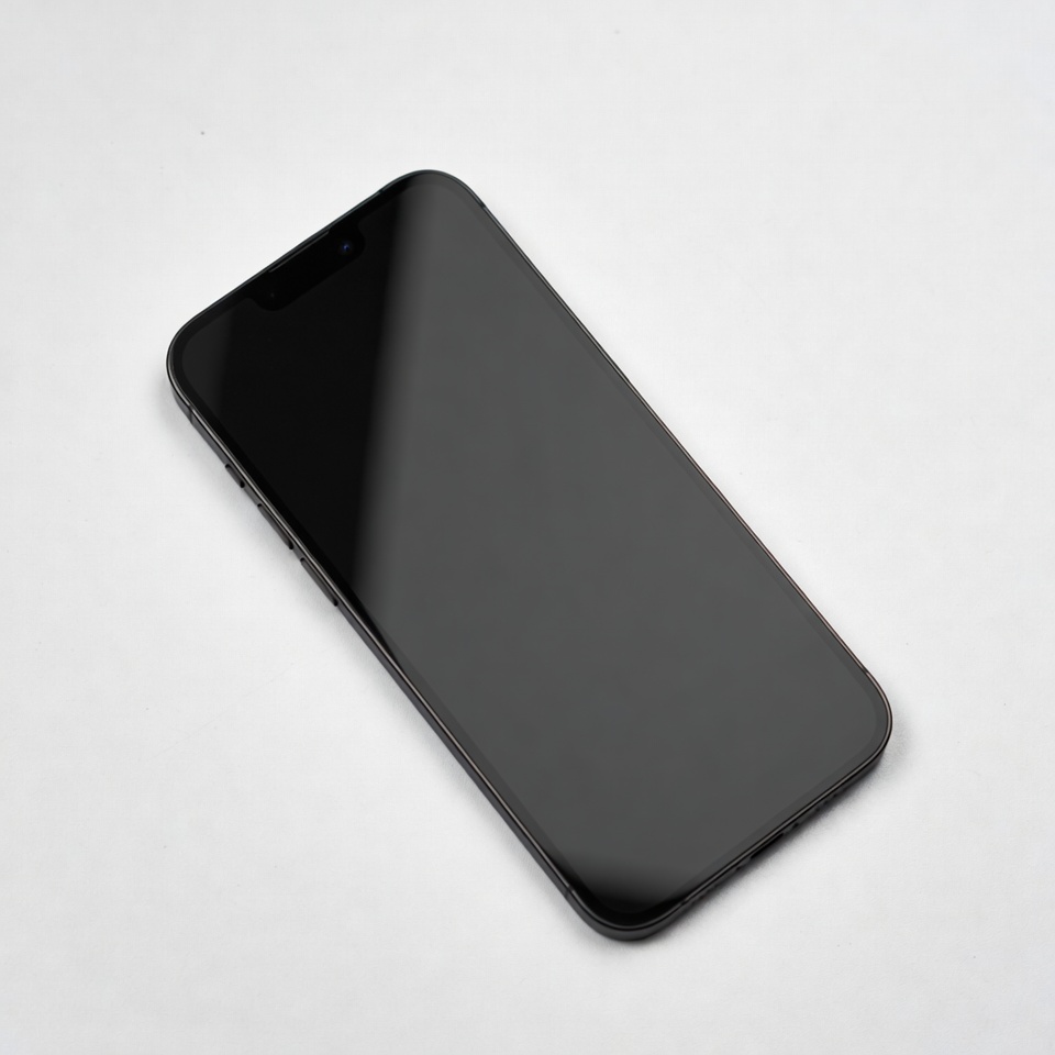 A sleek black iPhone lies at an angle on a plain white surface. The screen is off and reflects light, highlighting its glossy finish. The device features a notch at the top and volume buttons on the side.