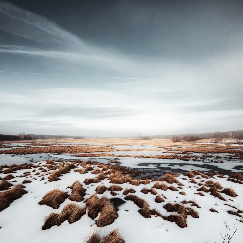 aerial view, bog, clouds, cold, environment, field, foggy, frost, grass, horizon, ice, landscape, natural, nature, outdoors, overcast, reeds, remote, scenery, serene, sky, snow, trees, tundra, water, wetlands, winter, marsh
