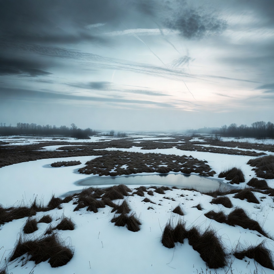 A vast snowy marshland stretches under a cloudy gray sky with contrails streaking across. Brown grasses poke through patches of snow, surrounding small frozen ponds and waterways. Distant dark trees line the horizon in the misty landscape.